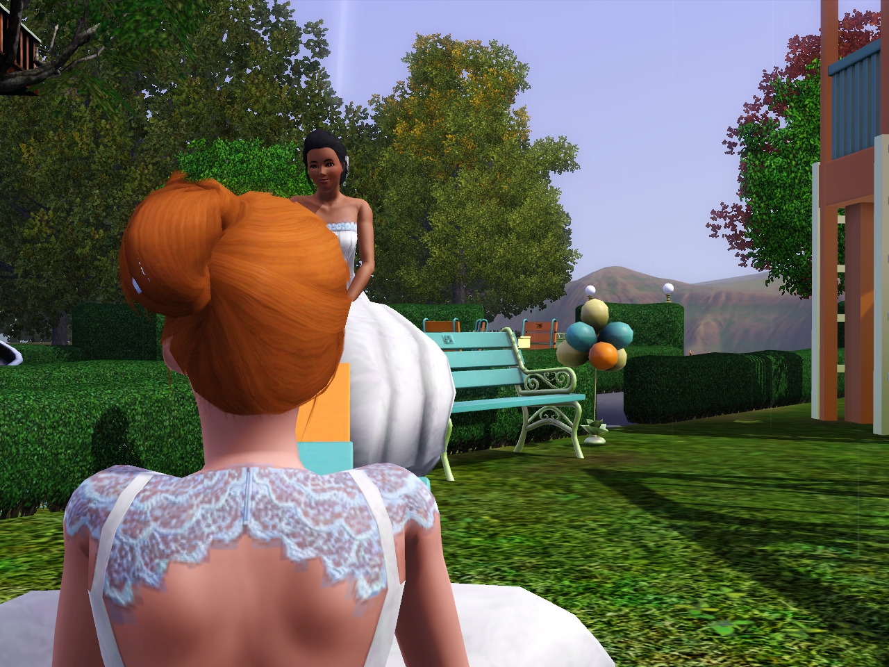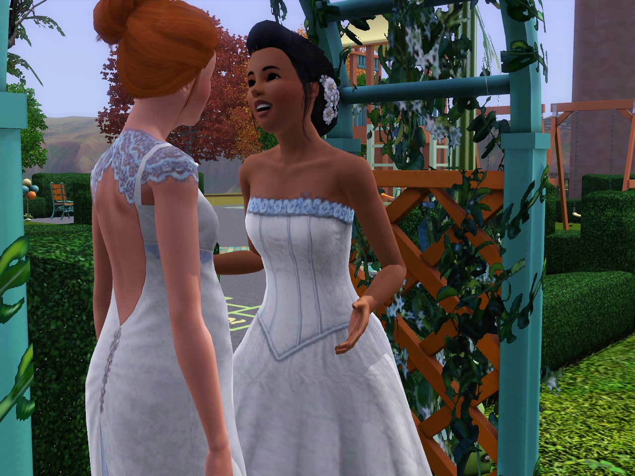 "Now it's my turn." She smirked at me, as I began being lifted off the ground. I imagine who ever designed my dress expected me to have a large indoor wedding... maybe a fancy outdoors one with expensive flowers and caviar. They probably didn't expect this, me actually playing in a playground, to happen five minutes after I just tied the knot.