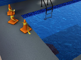 "Oh, the lawyers convinced the jury that the person was just clumsy and it had nothing to do with the ladder being rusty and part of the pool wall that hit them in the head, causing them to hit the floor. Don't worry, the autopsy wasn't incriminating. As for here, the roof's been leaking causes puddles and the floor partial collapsed with all the water weight."
