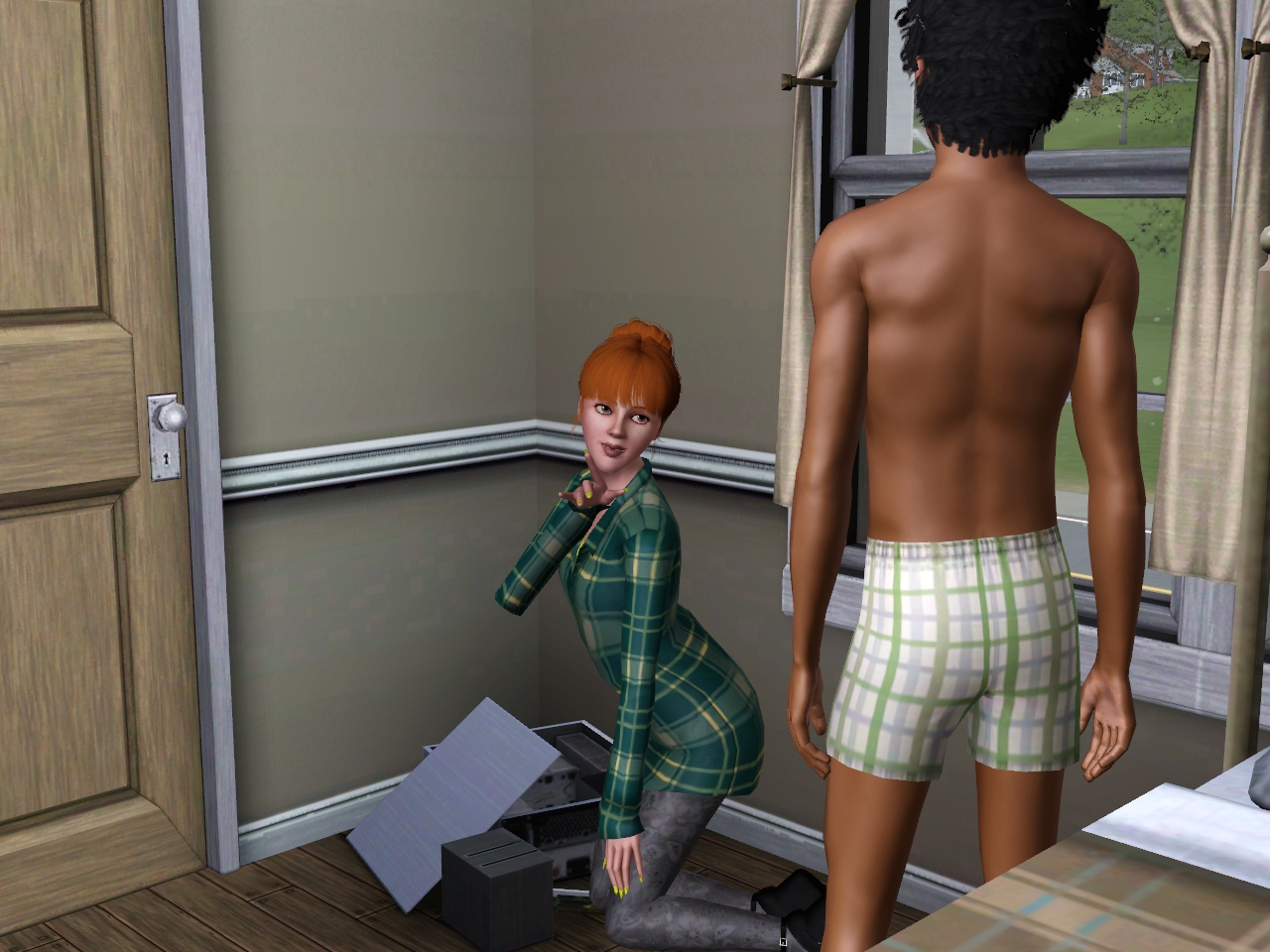 "Shut up, perv." I playfully said, as I stuck out my tongue, pulling on the leggings.